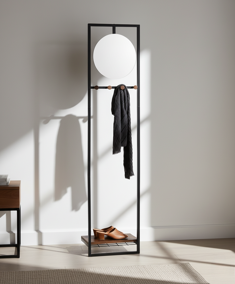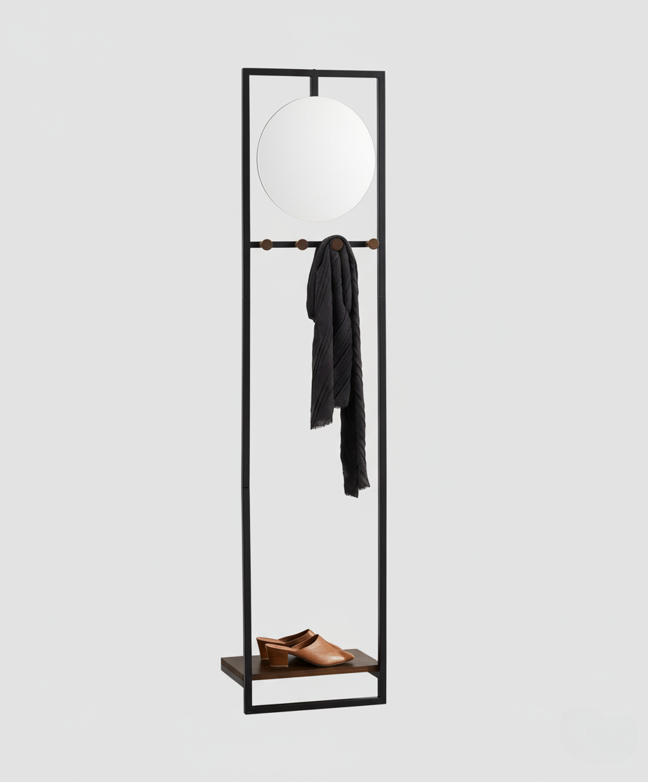 A sleek black metal entryway frame combining a round mirror, scarf bar, and bottom shelf for shoes or baskets. Paired with a geometric wood cabinet featuring gold legs and intricate carving, this setup offers visual balance and modern functionality. Perfect for curated entry zones, blending everyday utility with bold aesthetic appeal.
